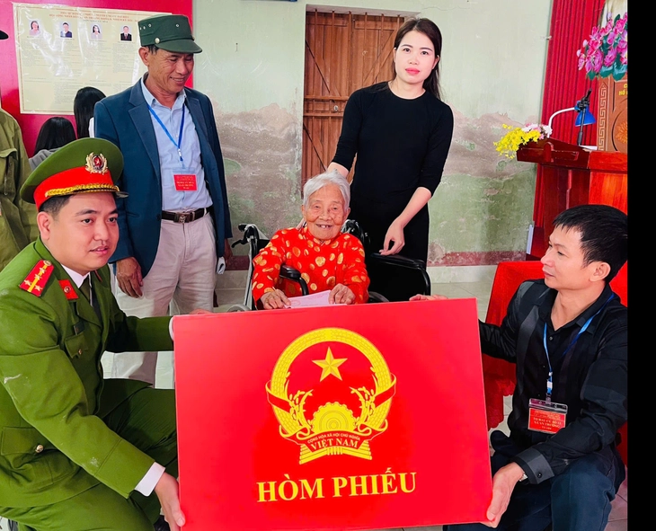 Do việc đi lại gặp nhiều khó khăn, cụ Hòa được lực lượng Công an xã An Trường tận tình hỗ trợ bằng xe lăn đưa vào khu vực bỏ phiếu.