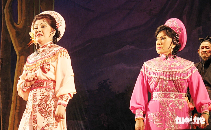 Sau khi nghệ sĩ Thanh Nga mất, cố nghệ sĩ Thanh Sang cũng từng diễn Tiếng trống Mê Linh với những cô đào đàn em, cụ thể là với nghệ sĩ Phượng Hằng. Họ vẫn tiếp nối vở Tiếng trống Mê Linh với thái độ làm nghề nghiêm túc - Ảnh: LINH ĐOAN