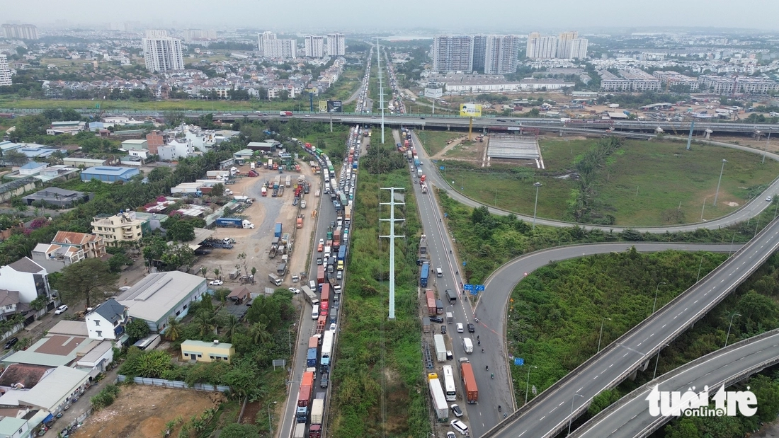 Dòng xe kẹt kéo dài đoạn gần lên nút giao cao tốc ngay vòng xoay Phú Hữu - Ảnh: MINH HÒA