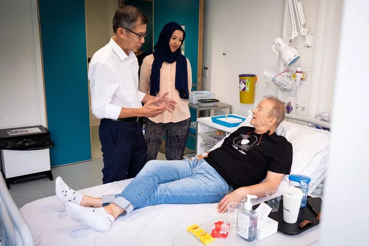 GS Siow Ming Lee và TS Sarah Benafif trò chuyện với ông Janusz Racz trước khi ông được tiêm vắc xin thử nghiệm - Ảnh: PA