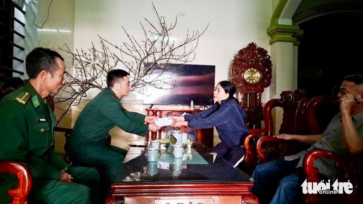 Trung tá Trần Văn Thế - Chính trị viên cùng tổ công tác Đồn biên phòng cửa khẩu cảng Cửa Lò - Bến Thủy đến động viên, tặng quà hỗ trợ gia đình các ngư dân bị nạn - Ảnh: LÊ THẠCH