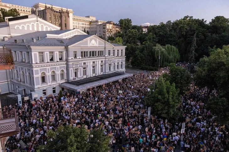 Người dân Ukraine biểu tình phản đối một đạo luật mới được thông qua nhằm hạn chế sự độc lập của các cơ chế chống tham nhũng, tại Kiev (Ukraine) ngày 23-7-2025 - Ảnh: REUTERS