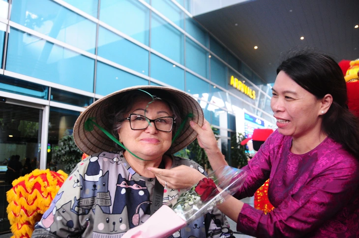 Các vị khách đầu tiên xuống Đà Nẵng được chào đón chiều 16-4 - Ảnh: B.D.