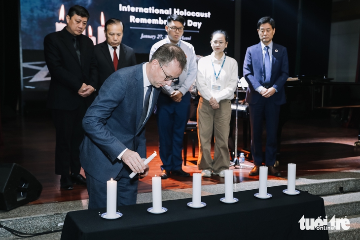 Đại biện lâm thời Đại sứ quán Đức tại Việt Nam Simon Kreye thắp nến tưởng niệm các nạn nhân Holocaust - Ảnh: DANH KHANG