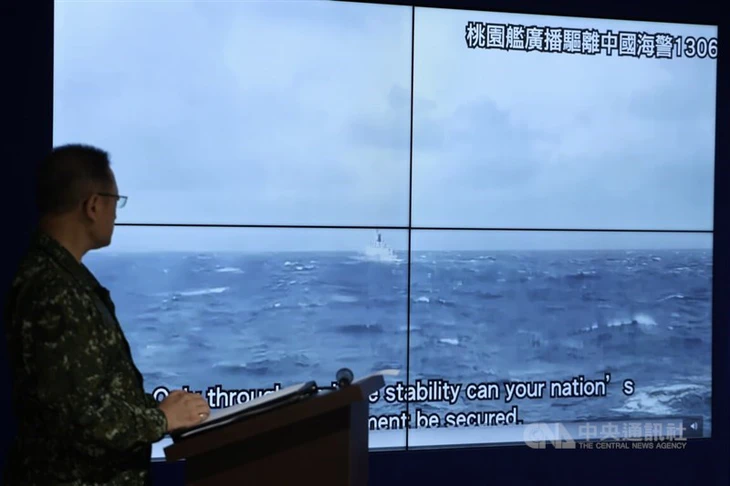 Vào ngày thứ hai tập trận quân sự của Trung Quốc hôm 30-12, Cơ quan Phòng vệ Đài Loan đã công bố đoạn video tại họp báo cho thấy tàu tuần tra lớp Taoyuan của Đài Loan phát đi cảnh báo để xua đuổi một tàu hải cảnh Trung Quốc. Trung Quốc xem Đài Loan là một phần lãnh thổ của mình và đến nay không loại trừ biện pháp vũ lực để thống nhất đất nước - Ảnh: CNA