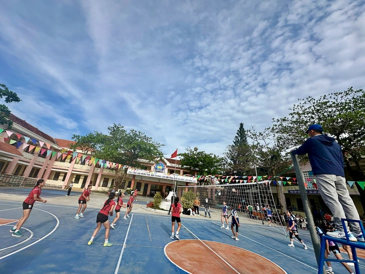 Học sinh Trường THCS Lương Thế Vinh, phường Tuy Hòa, Đắk Lắk tập luyện bóng chuyền - Ảnh: MINH CHIẾN