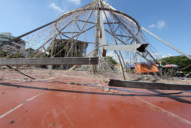 | Nhiều chiếc "nón lá" hoạt động gần một năm nay bị hư hỏng, lung lay trước gió đe dọa đến an toàn giao thông được phía công ty Sơn Lâm tháo dỡ - Ảnh: Tiến Thắng |