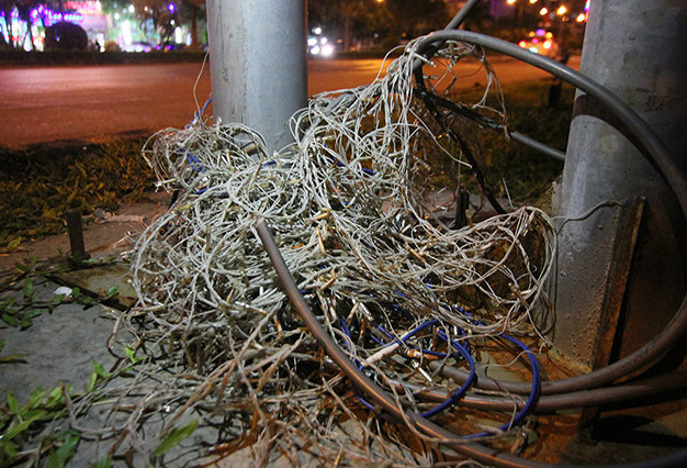 | Dây điện nối với hệ thống đèn được gắn kết sơ sài, rơi rụng trên thân cột - Ảnh: Tiến Thắng |