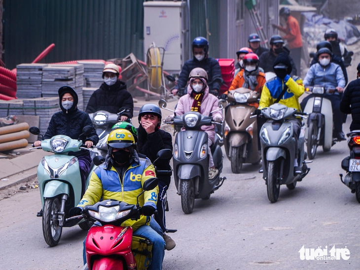 Ghi nhận của Tuổi Trẻ Online sáng 3-2, dọc tuyến đường, vật liệu xây dựng được tập kết ngay giữa lòng đường khiến xe cộ di chuyển khó khăn, ùn tắc.