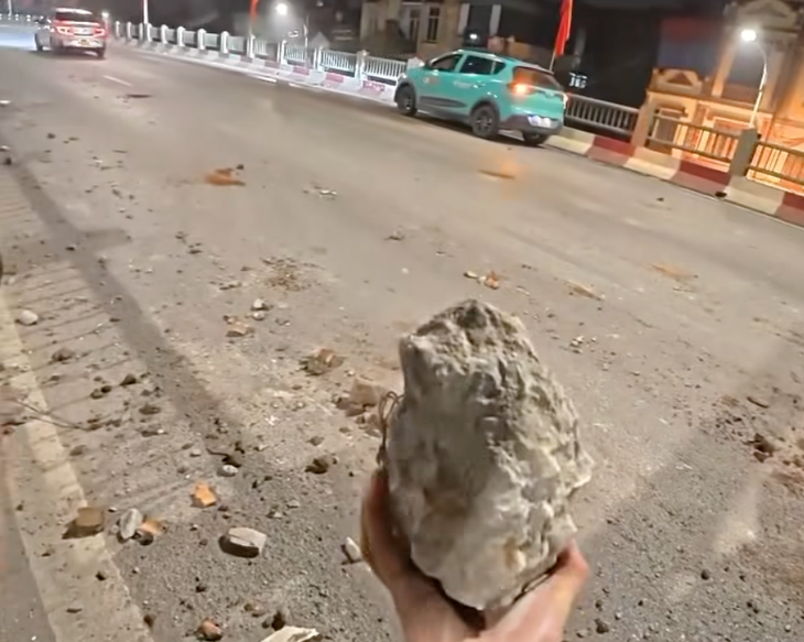 Sau đó chừng vài trăm mét, anh H. bắt đầu phải đánh lái né tránh hàng loạt khối vật liệu lớn vương vãi khắp mặt đường. Càng đi về phía cầu Vĩnh Tuy, những mảng gạch, bê tông càng nhiều và lớn dần, có khối nặng 3-5kg.