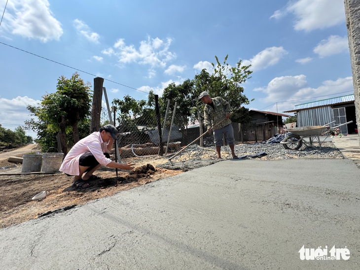 Anh Lý Nhau (áo hồng) tranh thủ làm sân trước nhà để phơi nông sản thu hoạch từ rẫy ở buôn cũ - Ảnh: TRUNG TÂN