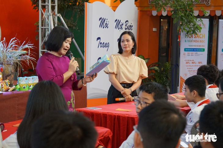 Nhà thơ Thụy Anh (trái) và nhà văn Cao Nguyệt Nguyên (phải) giao lưu, đọc sách 'Xa ngoài kia cánh đồng' với các bạn học sinh Hà Nội, nhân ra mắt tủ sách Giải thưởng Văn học Kim Đồng chiều 25-4 - Ảnh: T.ĐIỂU