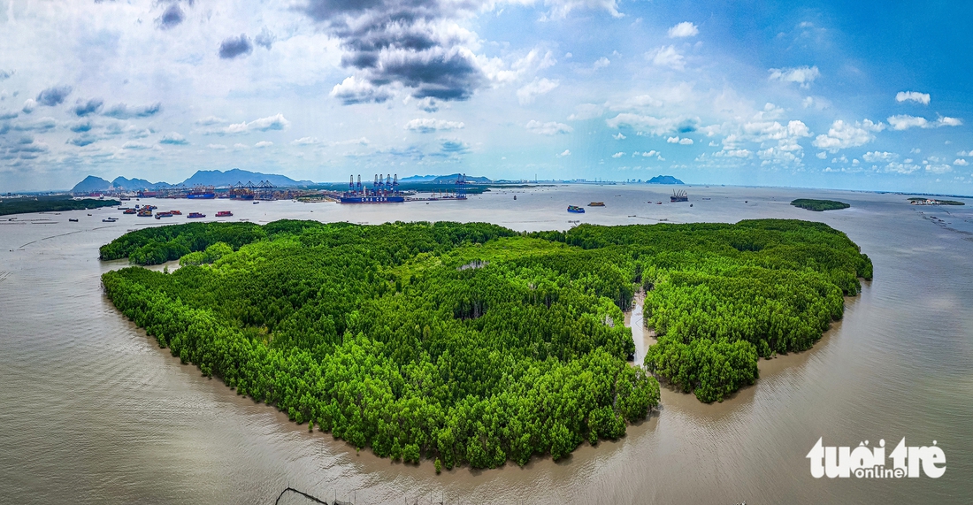 Toàn cảnh cù lao Phú Lợi (Cần Giờ, TP.HCM) nhìn từ trên cao nơi sắp trở thành siêu cảng trung chuyển quốc tế. Dự án có quy mô 571ha, tổng vốn đầu tư gần 5 tỉ USD, cầu cảng chính dài khoảng 7,5km, dự báo công suất đến năm 2030 đạt 4,8 triệu TEUs, tiến tới 16,9 triệu TEUs vào năm 2047, khả năng tiếp nhận tàu container trọng tải lớn lên tới 250.000 tấn