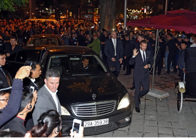 | Beckham vẫy tay chào người hâm mộ khi đến ăn tối tại một nhà hàng ở Hà Nội đêm 10-11. Ảnh: Việt Dũng |
