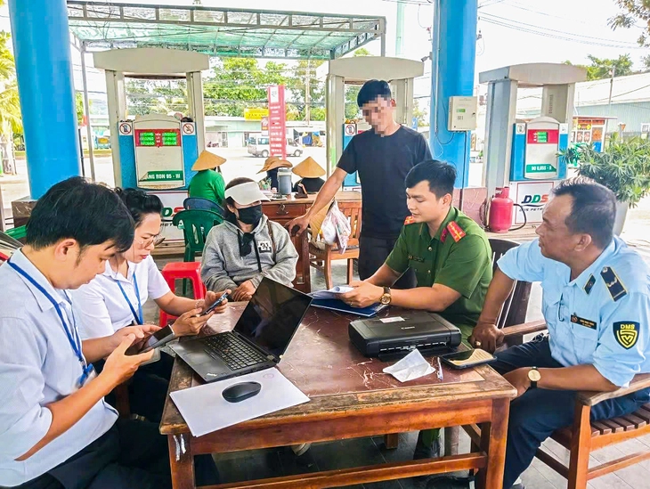 Đoàn kiểm tra 389 ở Phú Quốc lập biên bản vi phạm hành chính một doanh nghiệp bán xăng dầu có hành vi giảm lượng hàng bán không đúng quy định - Ảnh: UBND đặc khu Phú Quốc cung cấp