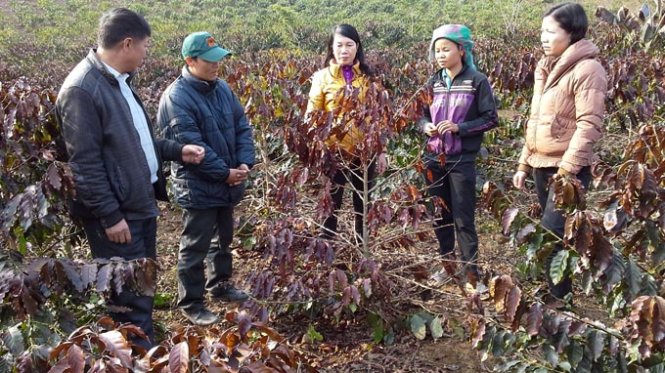 | Cán bộ khuyến nông hướng dẫn bà con nông dân cách cưa gốc cà phê và tủ gốc cho cây cà phê đã bị cháy do sương muối - Ảnh: Thúy Hà |