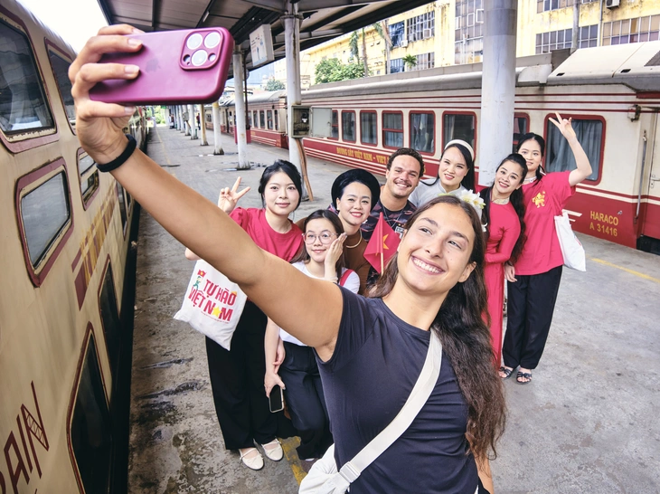 Người dân và du khách nước ngoài check-in chuyến tàu đoàn viên - Ảnh: BTC