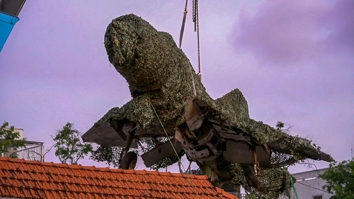 Chiếc tiêm kích được cẩu ngang cổng khu nhà ở công vụ cao khoảng 5m để lên xe chuyên dụng chở đi - Ảnh: THANH HUYỀN
