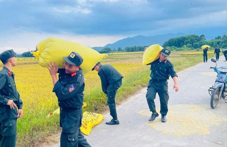 Cán bộ chiến sĩ chia nhau công việc, thu gom lúa giúp ông Hiển - Ảnh: PHI DŨNG