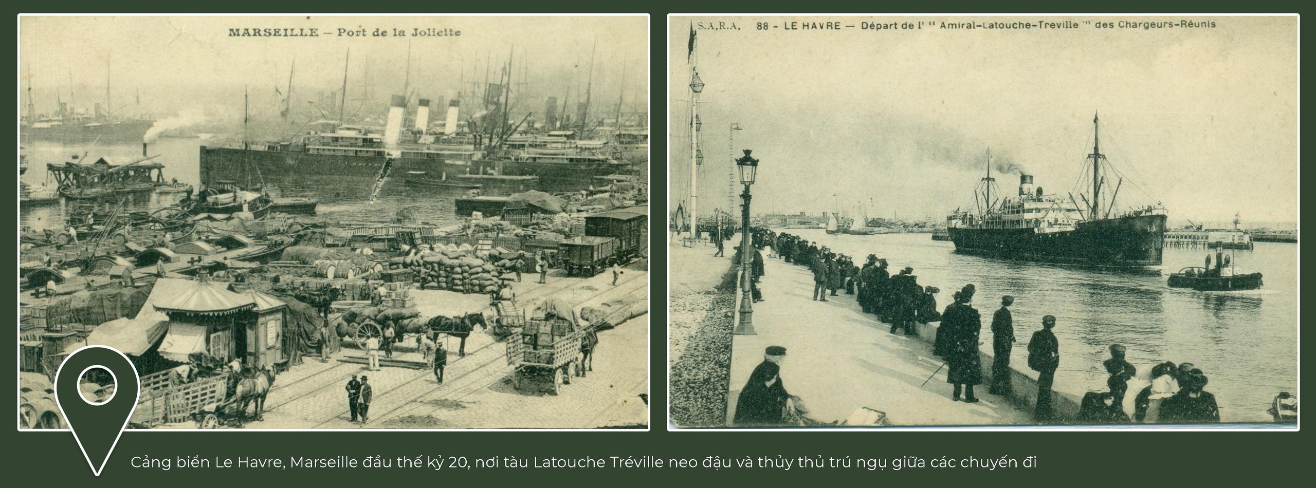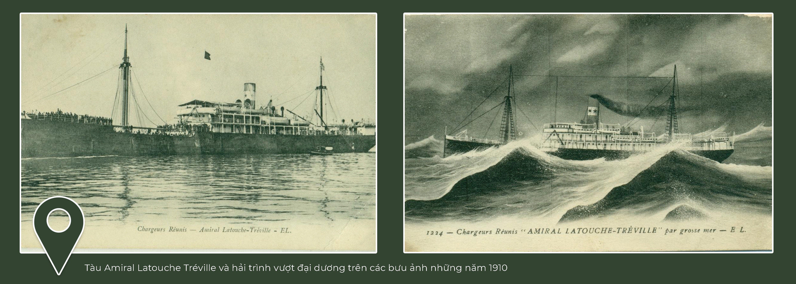 Trong hành trình sưu tập tư liệu, những tấm bưu ảnh cổ về con tàu Amiral Latouche Tréville trở thành những hiện vật đặc biệt quý giá. Đó là những tấm bưu ảnh được in tại Pháp vào đầu thế kỷ 20, ghi lại hình dáng của con tàu từng vượt qua Ấn Độ Dương, Hồng Hải, kênh đào Suez và Địa Trung Hải để đến Marseille.