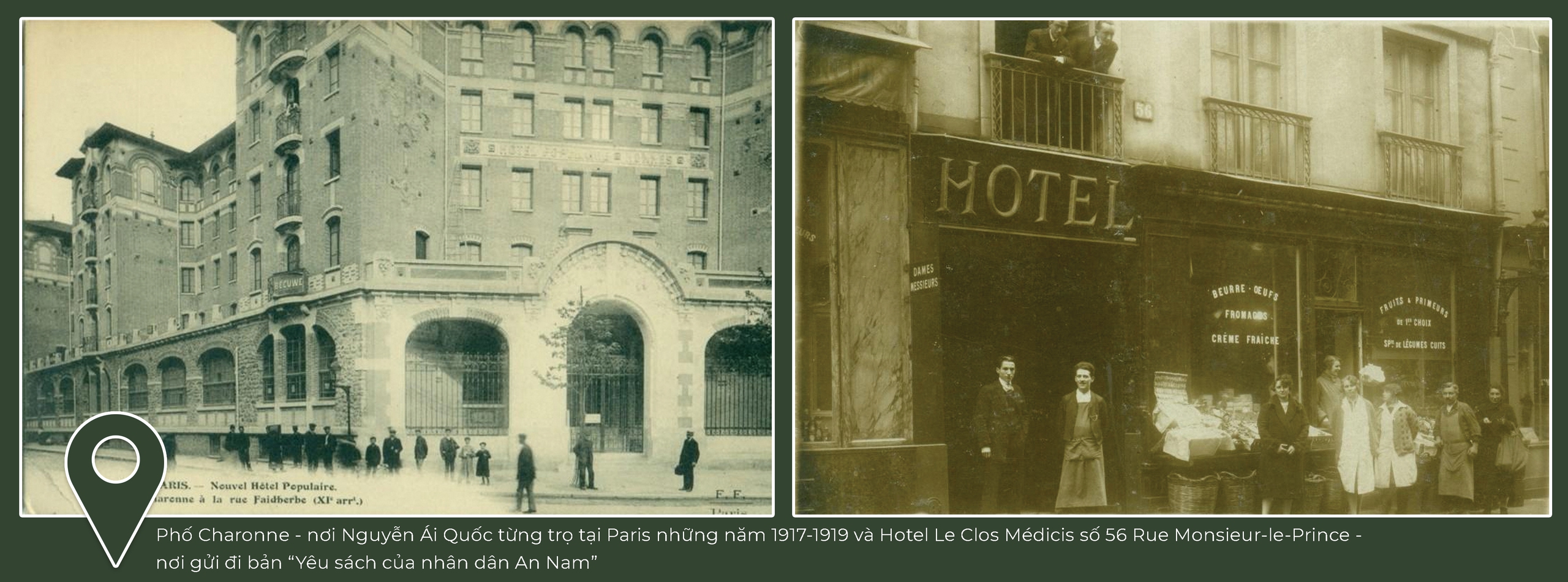 Một trong những địa chỉ được gợi mở là phố Charonne ở Paris. Theo một số tư liệu, năm 1917, Nguyễn Tất Thành từng thuê một căn phòng trọ tại đây. Trong kho bưu ảnh Paris đầu thế kỷ 20, tôi tìm thấy bức ảnh chụp Hotel Populaire - "Khách sạn Bình dân" ở số 94 Charonne, một cơ sở lưu trú dành cho những người lao động nghèo, thủy thủ và sinh viên.