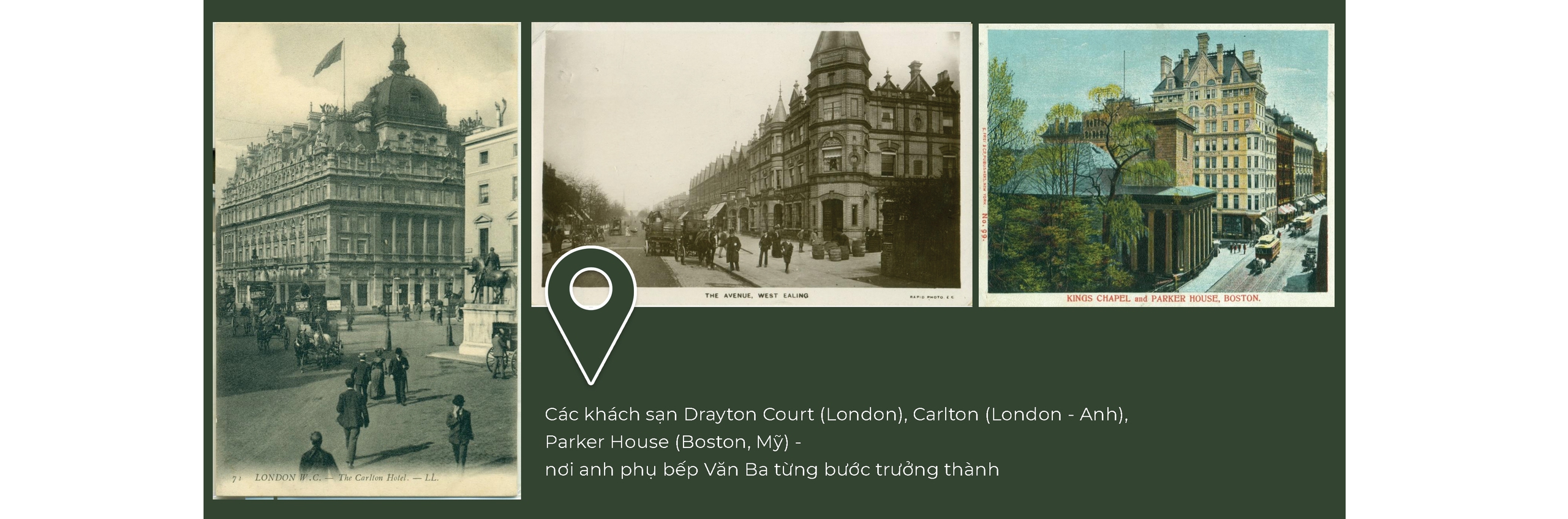 Xa hơn nữa, một số bưu ảnh cổ về khách sạn Parker House ở Boston cũng gợi lại giai đoạn anh từng làm việc trong nhà bếp tại đây.