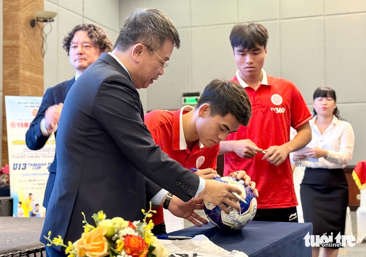 Công Phương, Văn Khang ký tặng bóng thi đấu cho Giải U13 toàn quốc 2026 - Ảnh: NGỌC LÊ
