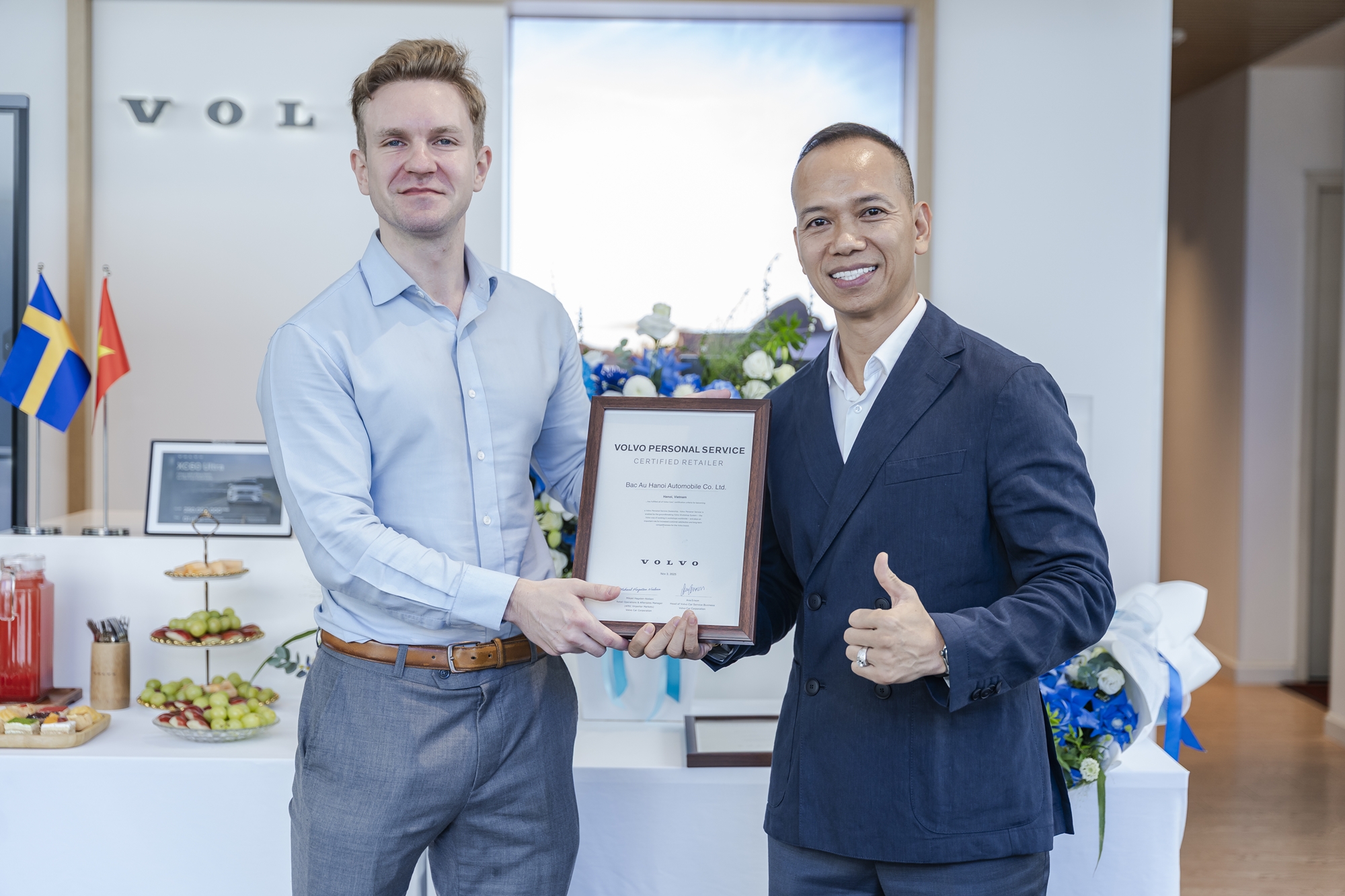 Ông Mikael Hagsten-Nielsen - Giám đốc vận hành đại lý và dịch vụ Volvo khu vực châu Á - Thái Bình Dương và ông Dương Phú Nam - Chủ tịch chuỗi đại lý Volvo Car Việt Nam - tại buổi trao chứng nhận VPS cho Đại lý Volvo Car Hà Nội - Ảnh: Volvo