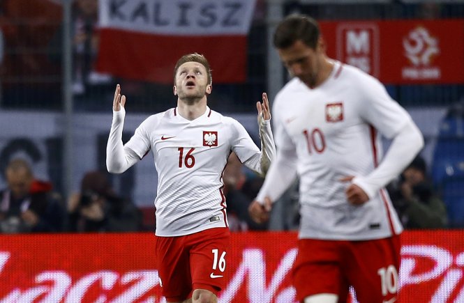 | Jakub Blaszczykowski (trái) ăn mừng bàn thắng ghi cho tuyển Ba Lan. Ảnh: Reuters |
