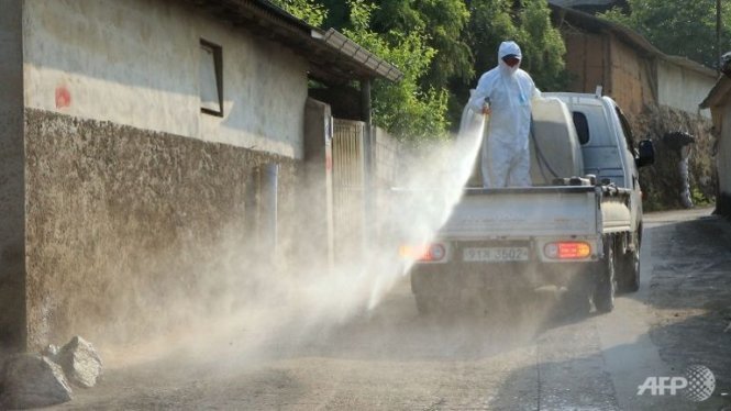 Một nhân viên y tế phun dung dịch sát khuẩn tại một ngôi làng thuộc hạt Sunchang Ảnh: AFP |