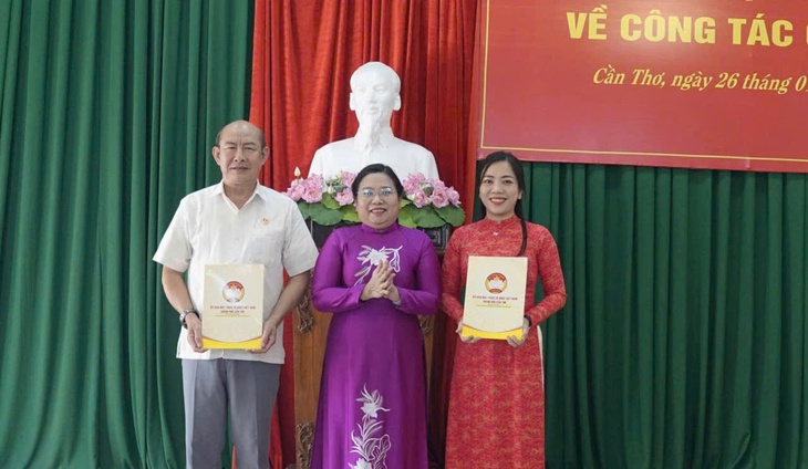 Bà Triệu Thị Ngọc Diễm (bìa phải) là đại biểu Quốc hội khóa XV, từng là Bí thư Tỉnh Đoàn Sóc Trăng (cũ), nhận quyết định điều động của Ban Thường vụ Thành ủy Cần Thơ ngày 26-1 - Ảnh: TRUNG PHẠM