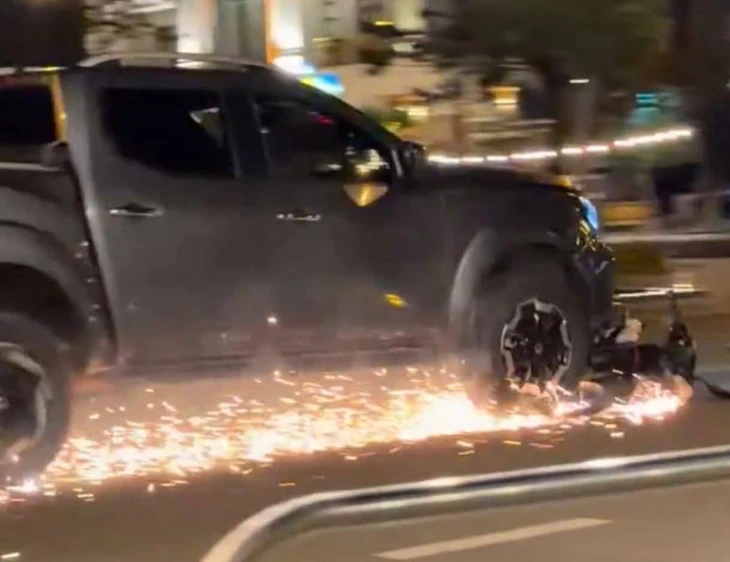 Chiếc xe bán tải kéo lê xe máy, bắn ra tia lửa tại Phan Thiết gây xôn xao mạng xã hội - Ảnh cắt từ clip mạng xã hội