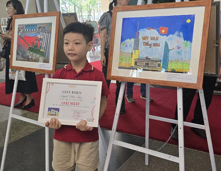 Tác phẩm Việt Nam thống nhất của em Huỳnh Phúc Huy là hình ảnh của Dinh Độc Lập ngày nay bên cạnh tòa nhà hiện đại Bitexco và Landmark 81 - là những biểu tượng tiêu biểu của TP.HCM.