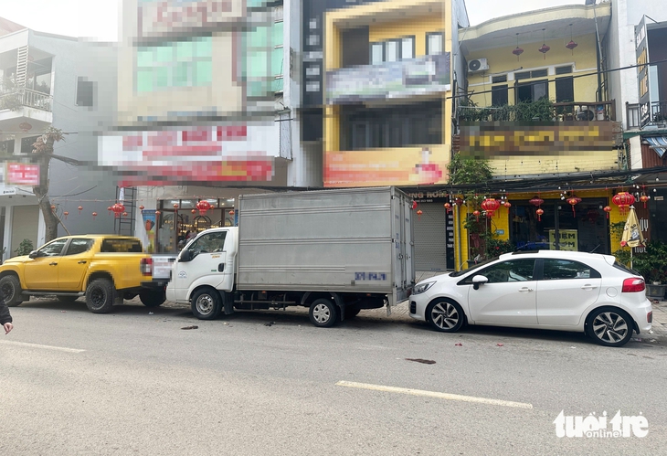 Đến sáng 12-2, chiếc xe tải đỗ trước cửa hàng anh Hùng vẫn đang bị khóa đầu, đuôi bởi hai chiếc xe khác - Ảnh: DOÃN HÒA