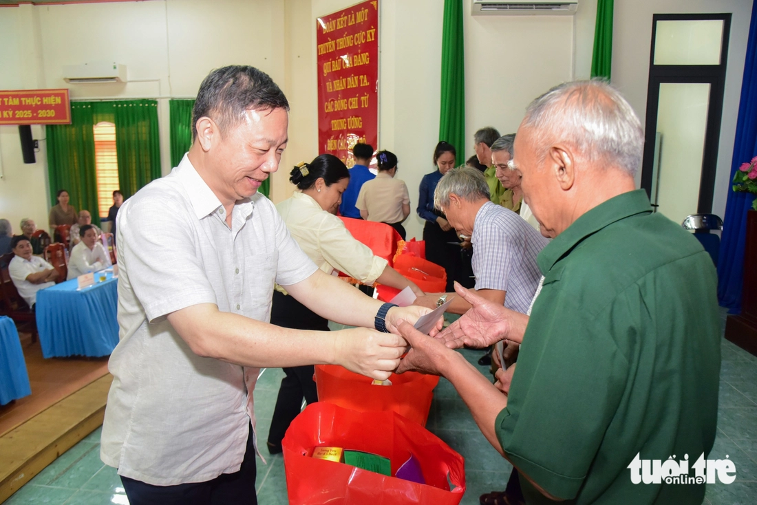 Ông Tăng Hữu Phong, Phó trưởng Ban Tuyên giáo và Dân vận Thành ủy TP.HCM, thăm hỏi, trao tặng quà tri ân các cựu chiến binh tại xã Long Hòa - Ảnh: TRÍ ĐỨC