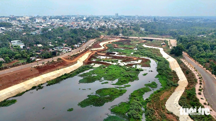 Hồ thủy lợi Ea Tam vẫn đang trong giai đoạn thi công sau khi chặn dòng, tích nước từ cuối năm 2025 - Ảnh: TÂM AN