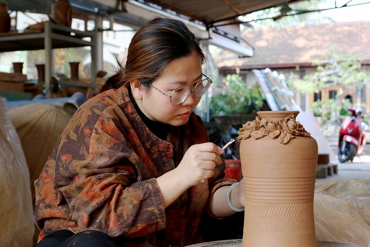 Nghệ nhân Đoàn Minh Ngọc (38 tuổi) chăm chút lại sản phẩm gốm vừa ra lò - Ảnh: P.SƠN