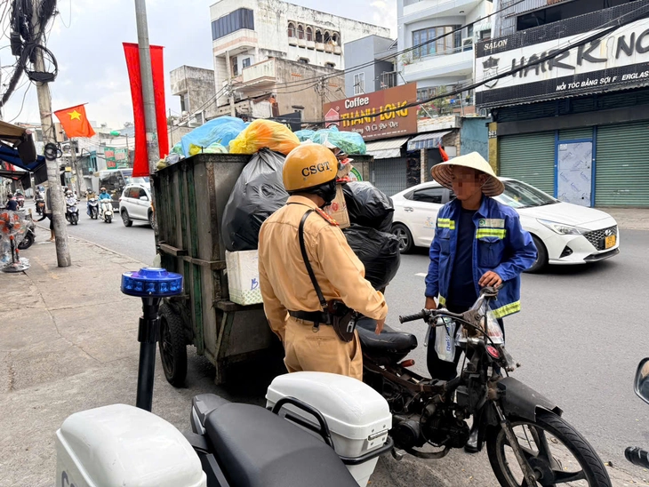 Tiếp đó lúc 16h cùng ngày, cảnh sát giao thông cũng dừng xe lôi tự chế chở rác chạy trên đường Xô Viết Nghệ Tĩnh (phường Thạnh Mỹ Tây, TP.HCM) xử lý hành vi tương tự.