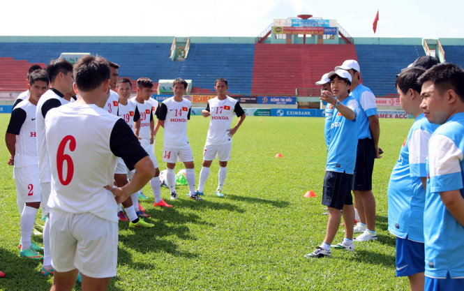 | HLV Toshiya Miura nói chuyện với các cầu thủ tại buổi tập. Ảnh: N.K |