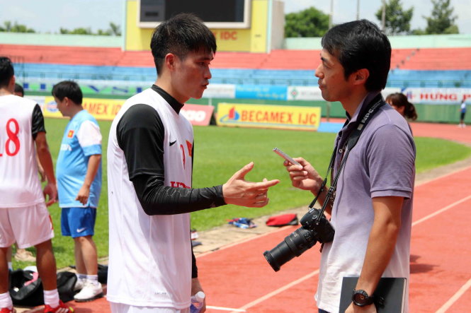 Và quả thật các cầu thủ đã không khỏi thở dốc trong các bài tập mà HLV Miura đưa ra trong buổi tập kéo dài suốt một tiếng rưỡi đồng hồ và dưới cái nắng gay gắt do thời gian tập trễ (9g30 mới bắt đầu tập). Do bài tập chia hai đội hình thi đấu ở hai phần sân cần bốn thủ môn nên HLV Miura đã mượn CLB B.Bình Dương thủ môn trẻ Hồ Tiến Duy lên tập chung với đội tuyển VN.