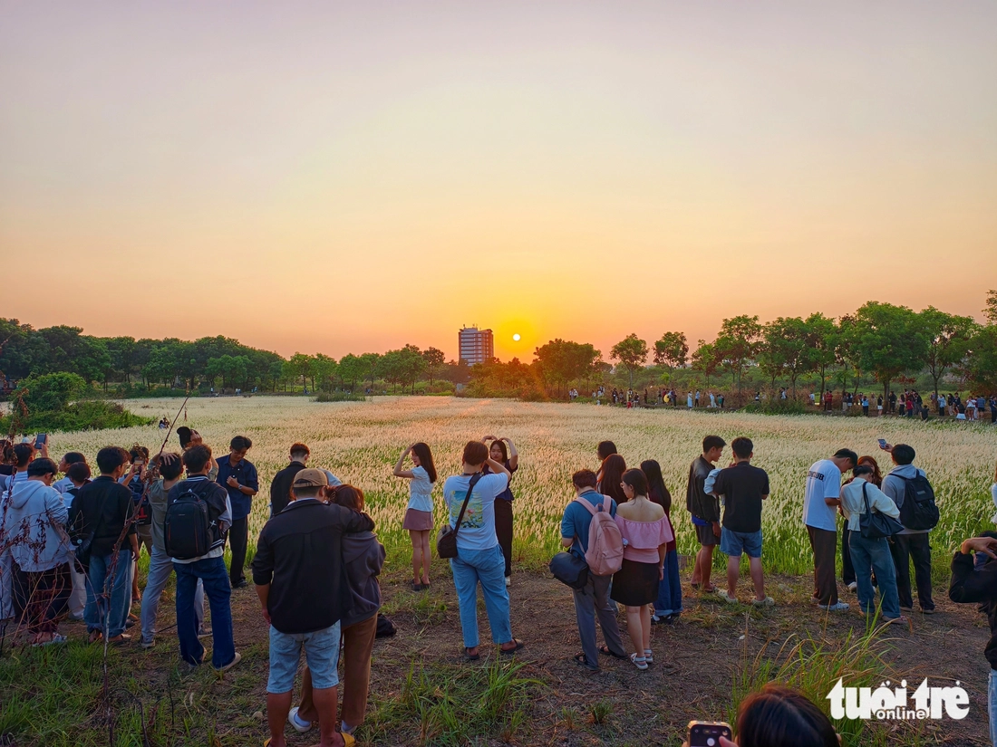Đồng cỏ đang trổ bông, thu hút rất nhiều người đến chụp ảnh, quay clip, phần lớn là các bạn trẻ - Ảnh: NGỌC KHẢI