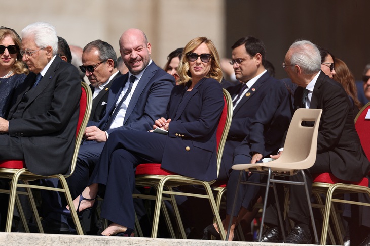 Thủ tướng Ý Giorgia Meloni ngồi cùng các quan chức cấp cao tại quảng trường Thánh Peter - Ảnh: REUTERS
