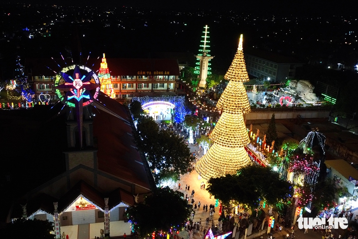Cây thông Noel 4 tầng, cao 35m làm từ gần 3.000 nón lá ở giáo họ Hà Phát (phường Long Bình, Đồng Nai) tiếp tục là điểm check-in ưa thích của các bạn trẻ - Ảnh: A LỘC