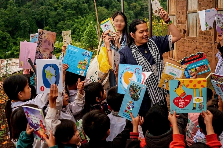 Ông Hoàng Hoa Trung (đeo khăn rằn), người sáng lập dự án Nuôi em trong một chương trình thiện nguyện - Ảnh: Dự án Nuôi em