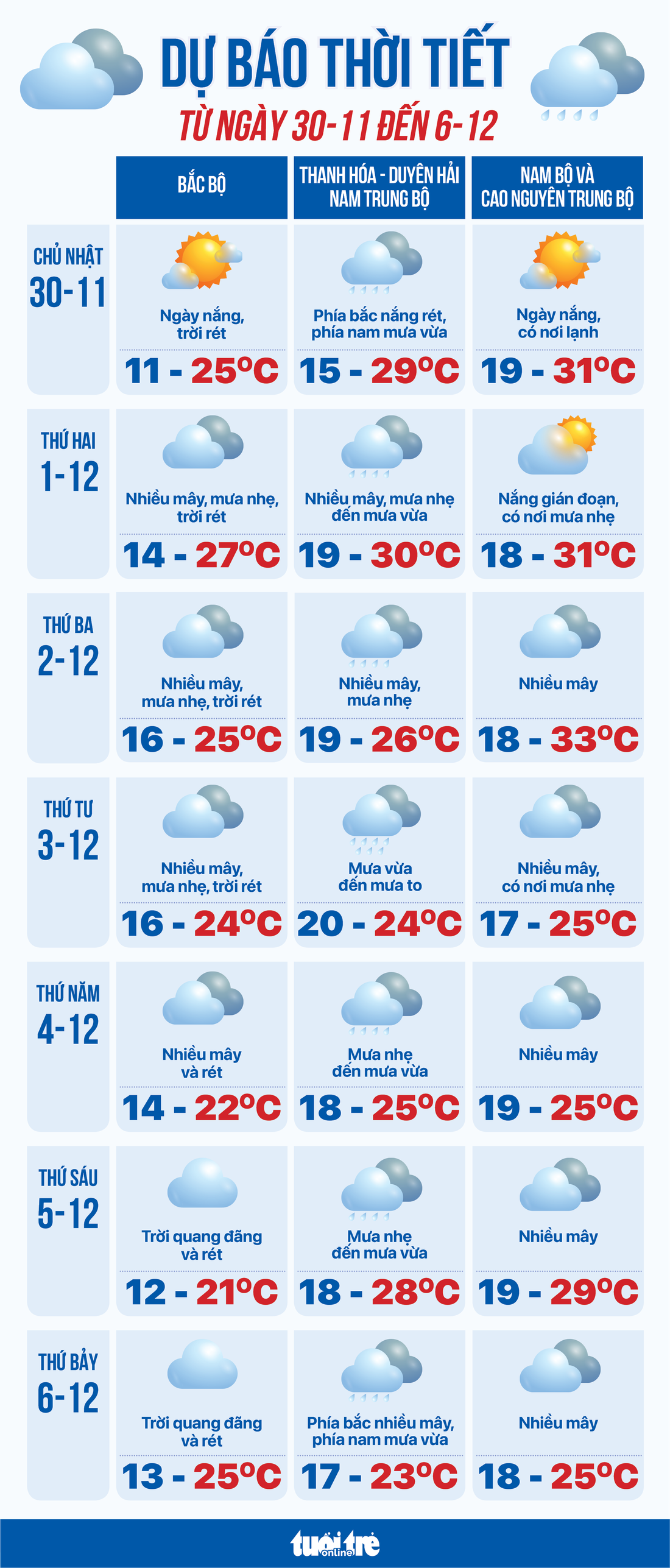 Dự báo thời tiết tuần từ 30-11 đến 6-12: