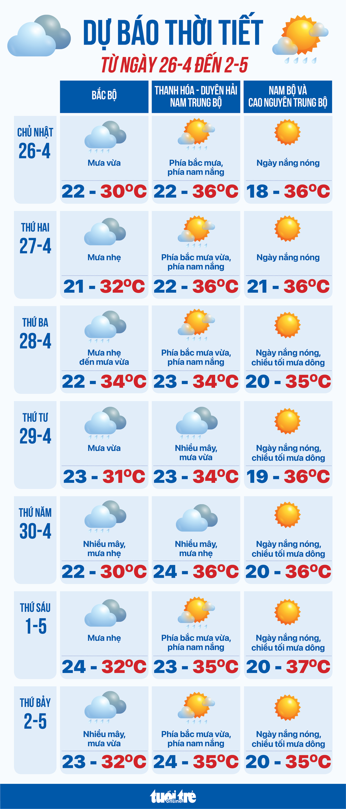 Dự báo thời tiết tuần từ 26-4 đến 2-5: