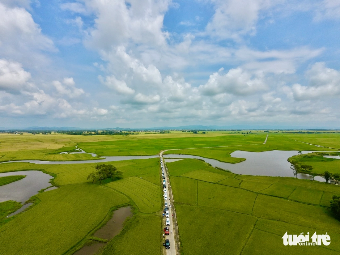 Du khách tham gia caravan đi qua cánh đồng lúa xanh mướt - Ảnh: MINH CHIẾN