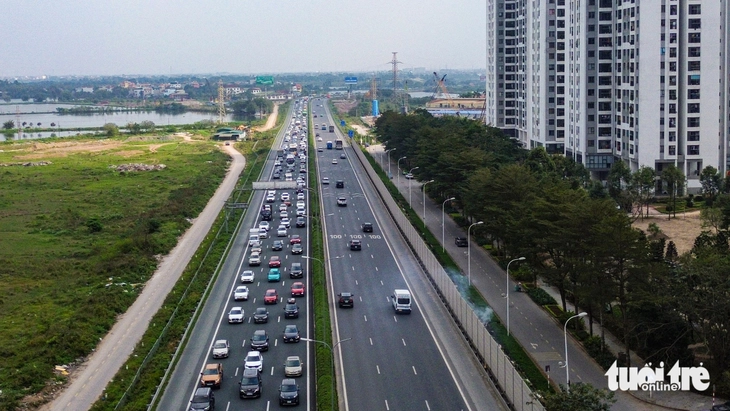 Dòng xe trên cao tốc Pháp Vân - Cầu Giẽ ùn ùn hướng vào Hà Nội trong khi hướng ra khỏi thành phố thông thoáng vào chiều 21-2 - Ảnh: HỒNG QUANG