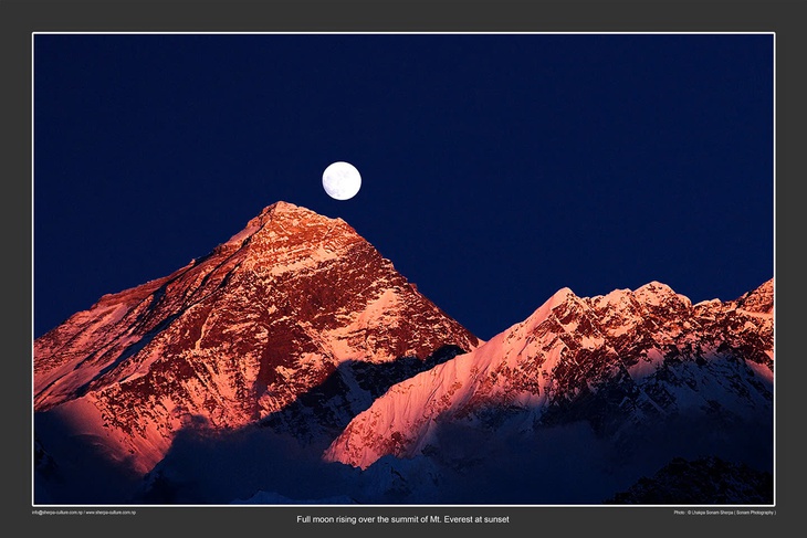 Trăng tròn mọc trên đỉnh núi Everest lúc hoàng hôn - Ảnh: Lhakpa Sonam Sherpa