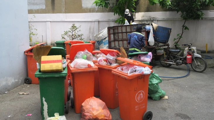 Phan loại rác tái chế (thùng cam) và rác sinh hoạt (thùng xanh) tại một chung cư ở phường Hạnh Thông, TP.HCM - Ảnh: T.T.D